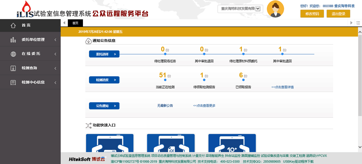 系統(tǒng)功能全面,核心功能包括試驗(yàn)檢測(cè)業(yè)務(wù)管理、管理體系執(zhí)行與跟蹤、工地以及駐外試驗(yàn)室管理等,提供了試驗(yàn)室檢測(cè)業(yè)務(wù)的全方位控制與管理,對(duì)試驗(yàn)檢測(cè)業(yè)務(wù)管理